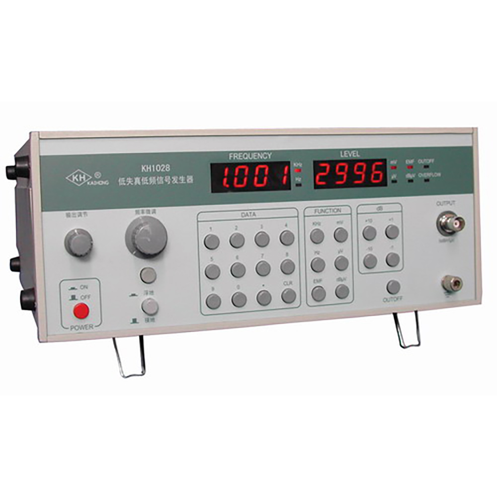 KH1028型低失真低頻信號發生器,是為低頻和甚低頻范圍內的用戶專門設計的一臺高檔儀器。輸出電壓、頻率可由前面板上的鍵盤直接預置,電壓顯示方式有dB、mV、μV、v可供選擇,省去了老式儀器dB和電壓轉換要靠查表和計算的麻煩。
